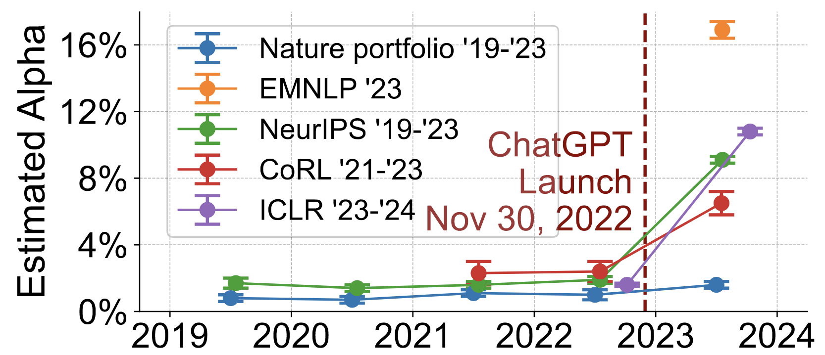The question of the extent to which peer reviewers are using LLMs for their reviews has been investigated by Liang et al. (2024). Their method for determining LLM use a trained maximum likelihood-based model that is validated using a corpus of reviews written before the release of ChatGPT. The method predicts a parameter ɑ (alpha) that essentially denotes the portion of sentences in a corpus that have been “substantially” modified or written by an LLM. They investigate four different machine learning/NLP conferences (ICLR 2024, NeurIPS 2023, CoRL 2023, EMNLP 2023) and a number of journal reviews from Nature.